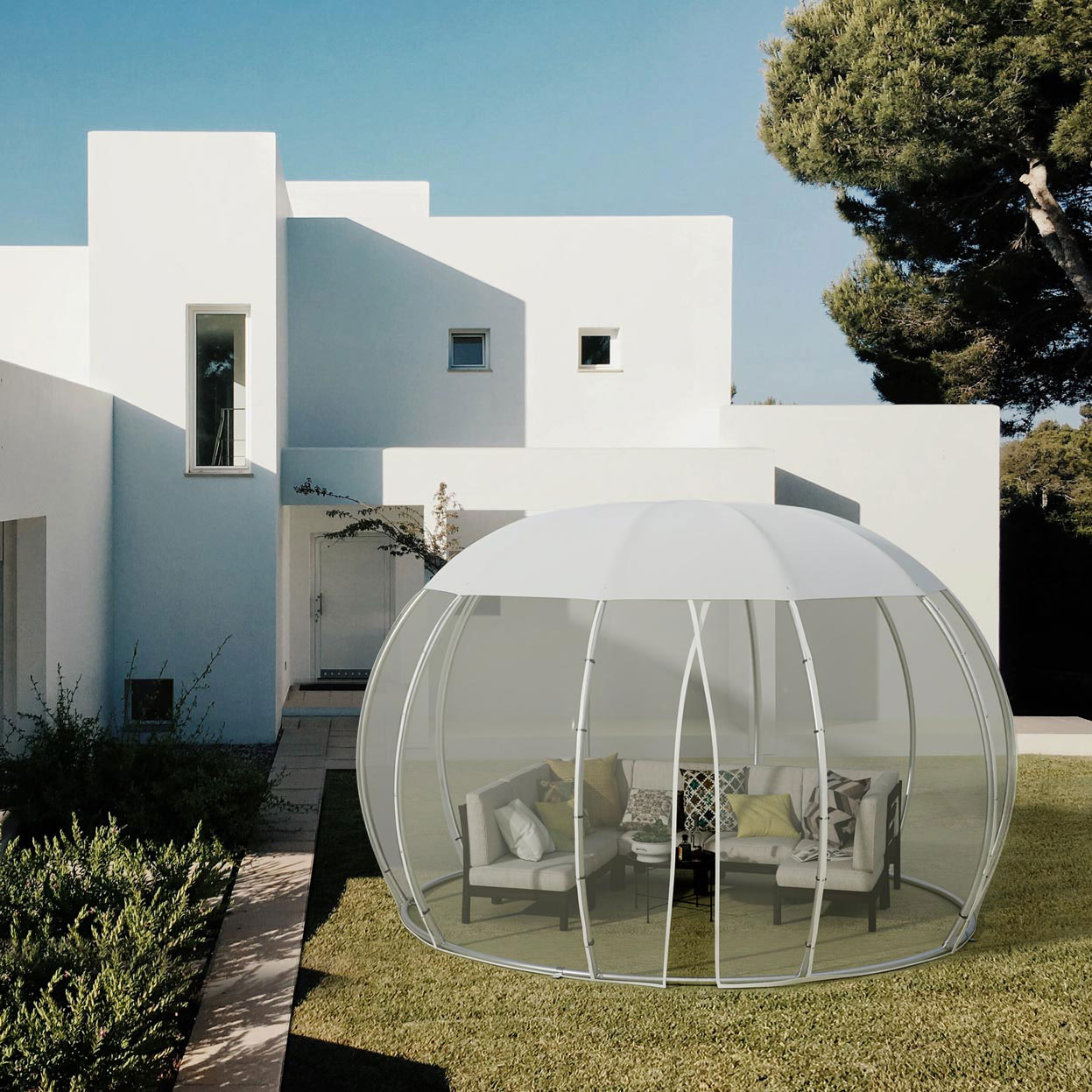 Breng je buitenervaring naar een hoger niveau met de Astreea Igloo Max + Parasoltop met hor/vitrage panelen. Deze innovatieve combinatie biedt zowel bescherming als elegantie, waardoor je van je buitenruimte kunt genieten zonder insecten en andere ongemakken.